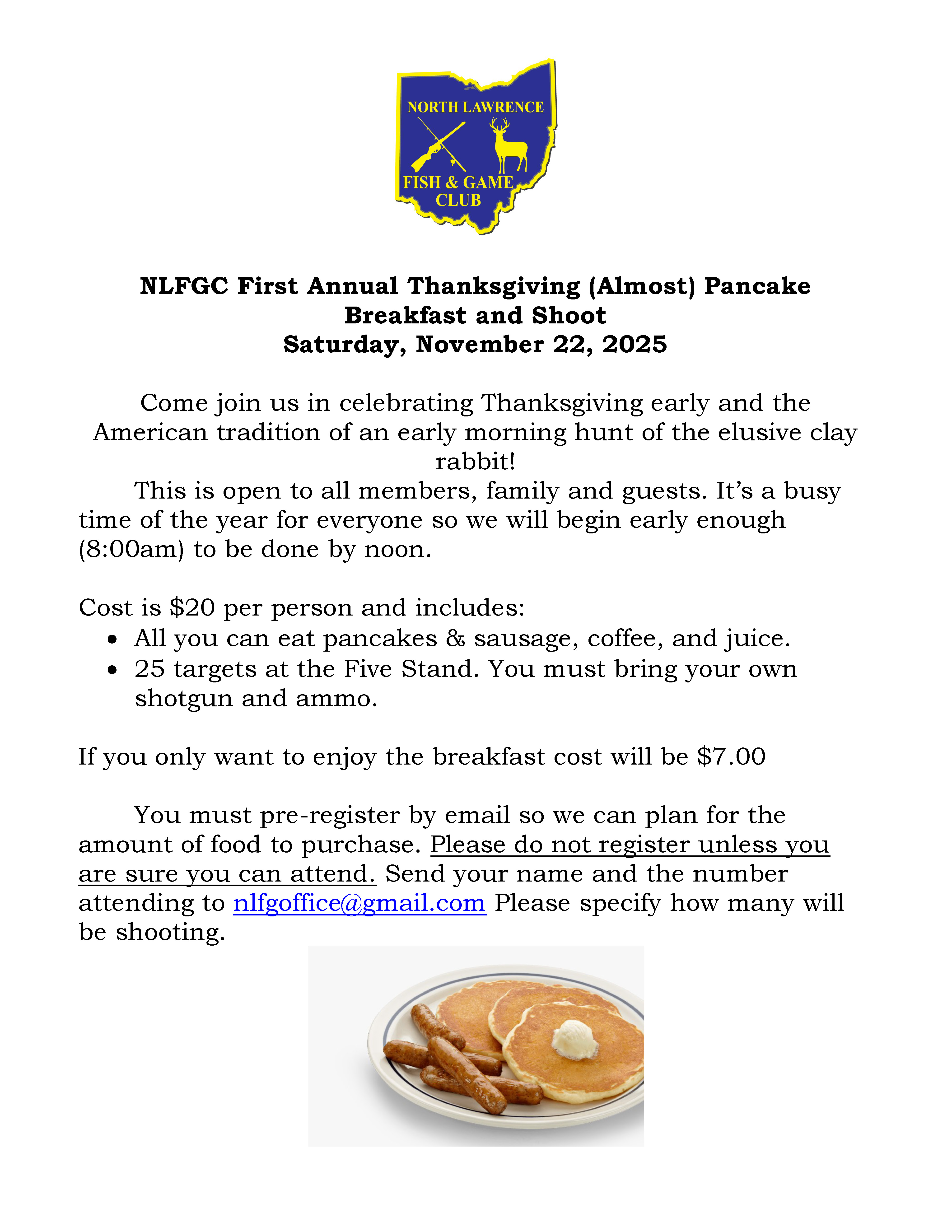 NLFGC First Annual Thanksgiving (Almost) Pancake Breakfast and Shoot October 20, 2025 Leave a comment